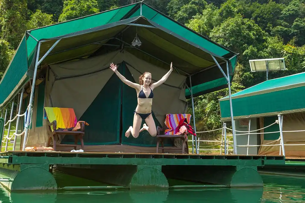 Elephant Hills are Thailand's first Luxury Tented Jungle Camps, combining the camp concept of African national parks with our elephant park's Thai tropical forest environment. We offer 2-4 day nature soft adventure tours in and around the breathtakingly beautiful Khao Sok national park area, complete with luxury tents for overnight accommodations. The Elephant Camp, which consists of custom-made luxury tents, has been in operation for over ten years and has become a popular family vacation destination. The floating Rainforest Camp, one of the world's only luxury floating tented camps, opened in 2011 on Cheow Larn Lake's emerald green waters.