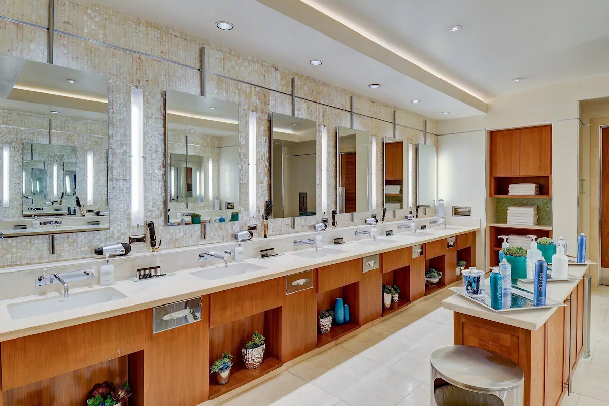 • Men’s spa area features a “shy guy” treatment room and an outdoor relaxation balcony overlooking the pool